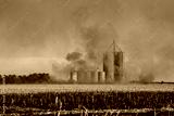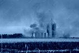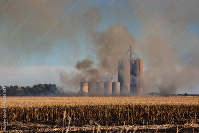 Wide angle landscape shot of a silo in a burning agriculture field of crops