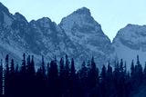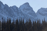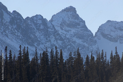 A wide angle landscape shot of dramatic, snowy mountain peaks covered in snow with pine trees, an outdoor winter background