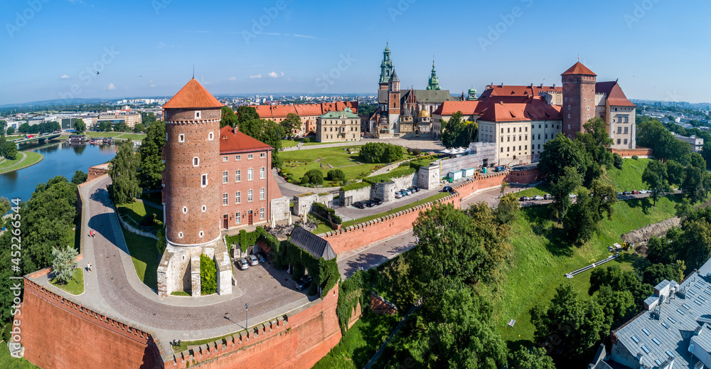 Royal Wawel Castle and Gothic Cathedral in Cracow, Poland, with Renaissance Sigismund Chapel with golden dome, Sandomierska and Senatorska towers, walls, yard, park and tourists. Aerial view