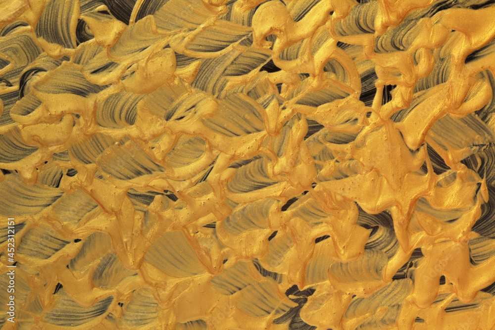 Abstract gold (bronze) and black color acrylic blot painting wall. Canvas vintage grunge texture horizontal background.