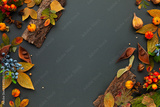 Autumnal-winter composition with dried leaves, pumpkins, bark of trees and berries on dark background. Frame of plants. Flat lay, copy space.