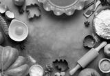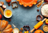 Concept homemade fall baking with pumpkin,apples, food ingredients, spices and kitchen utencil.