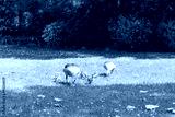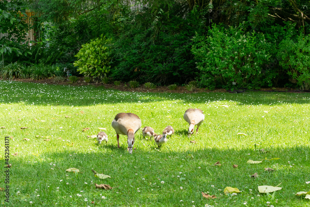 Kaczki szukające pożywienia w ogrodzie botanicznym, Frankfurt nad Menem