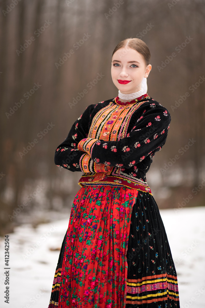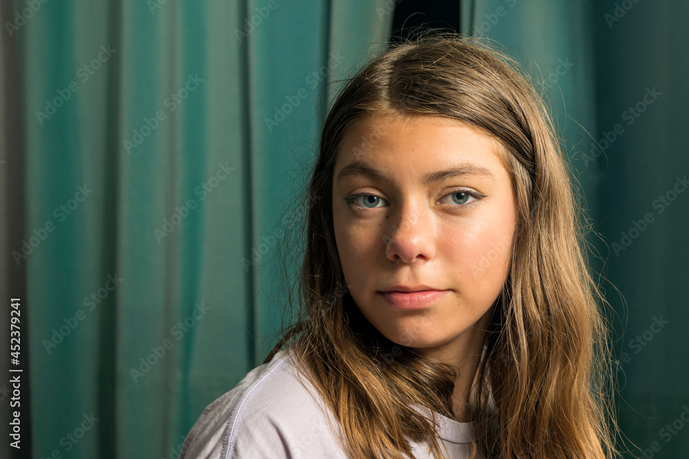 Portrait of a cute European teenage girl in fashionable clothes on a turquoise background