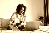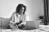 Young African American girl student studying virtual course, learning distance class taking web training, looking at laptop computer watching online webinar and writing notes sitting on bed at home.