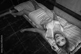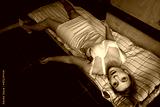 Strangled beautiful woman in a bedroom. Simulation of the crime scene.........