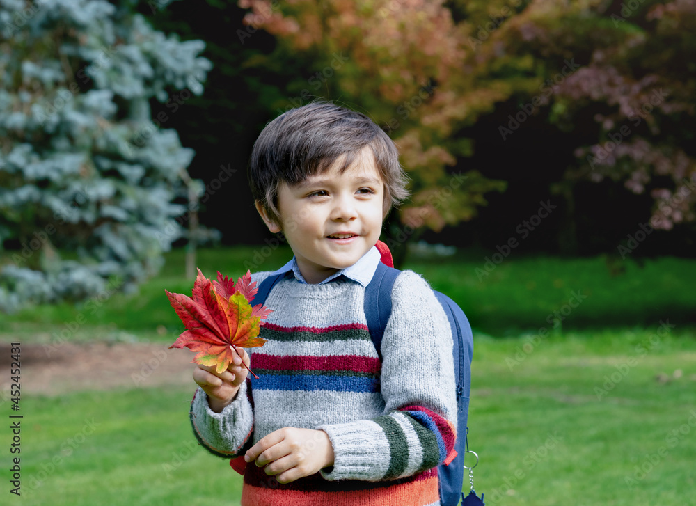 Happy boy holding autumn leaves in the garden, portrait child wearing jumper playing outside, Active kid carrying backpack having fun playing around and get exciting for adventure in Autumn forest