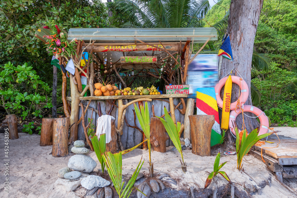 Exotic summer beach bar with mixed fruits coconut, banana and tropical fruits in Seychelles tropical island.