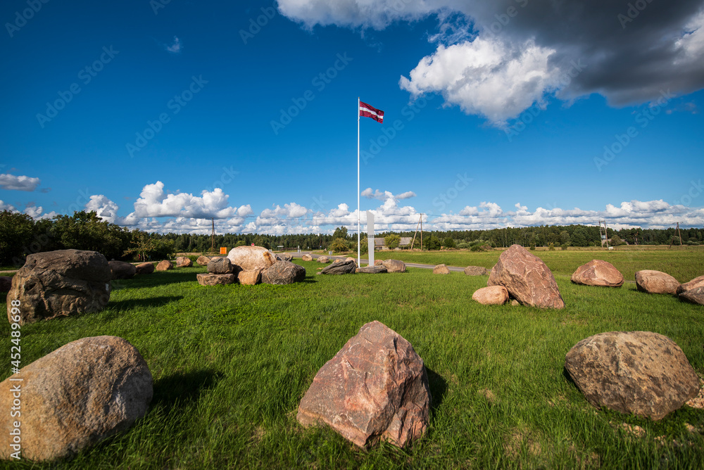 Memorial place with large stones. A flowing Latvian flag on a long mast.