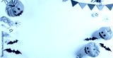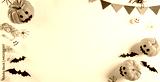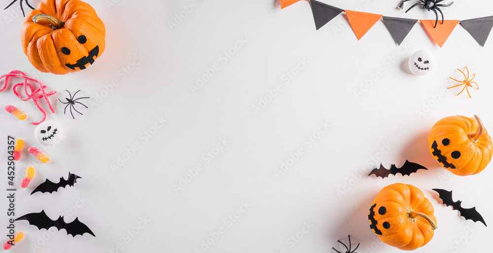 Halloween decorations made from pumpkin, paper bats and black spider on pastel orange background. Flat lay, top view with copy space for text.