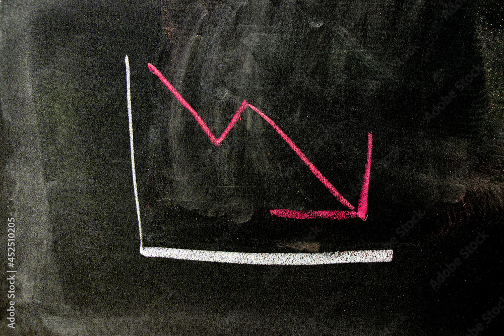Red color chalk handdrawing in arrow down shape on blackboard or chalkboard background (Concept of stock decline, down trend of business, economy)