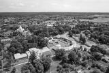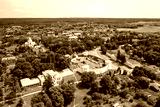 Round yard building against blue sky background. Galitzine palace in Trostyanets aerial view