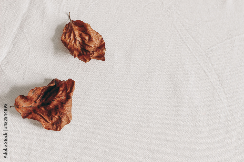 Autumn still life. Dry beech leaves on linen fabric table cloth textile background. Fall and Thanksgiving concept. Seasonal composition. Styled flat lay photography. Top view, no people.