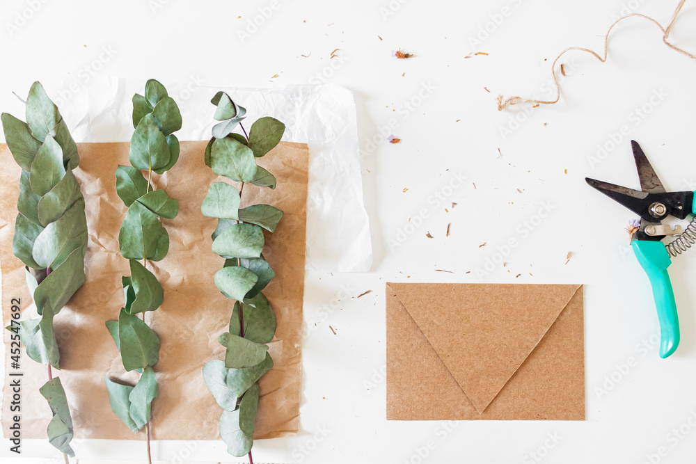 Creative retro style composition of craft envelopes, blank paper sheet and eucalyptus branches on white background. Florist, flower shop, gift concept.