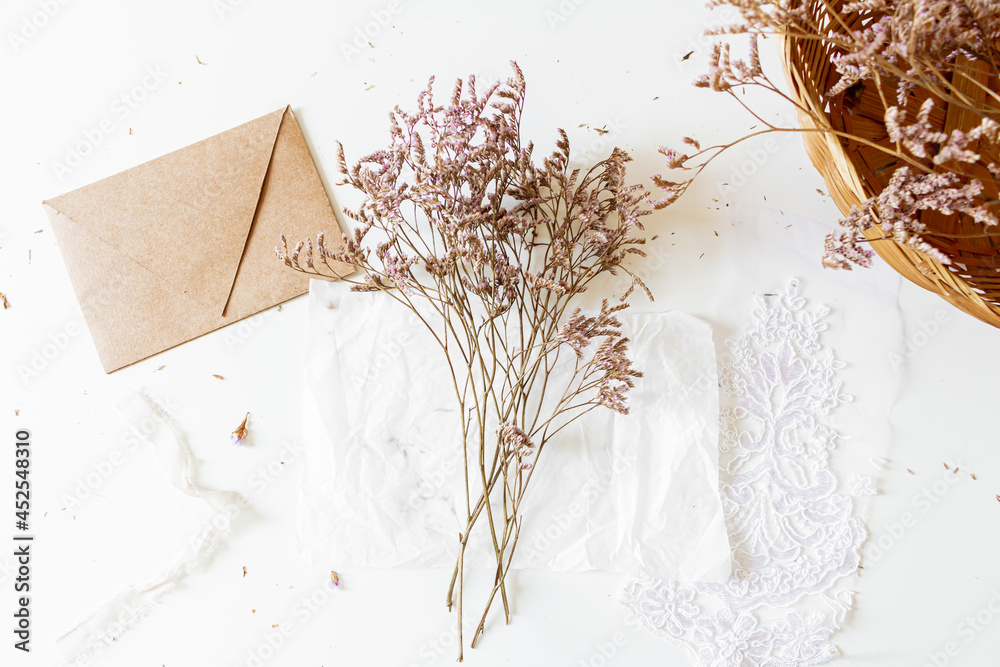 Dried Lilac Flowers Bouquet on white background. Flat lay, top view.