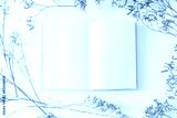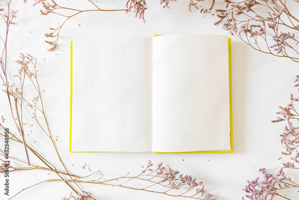 Round frame made of lilac flowers on white background with blank paper open book. Flat lay, top view.
