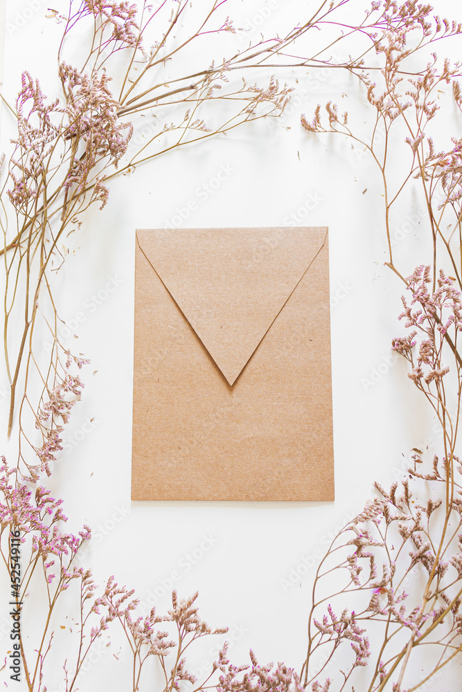 Round frame with lilac flowers and kraft paper envelope. Flat lay, top view.