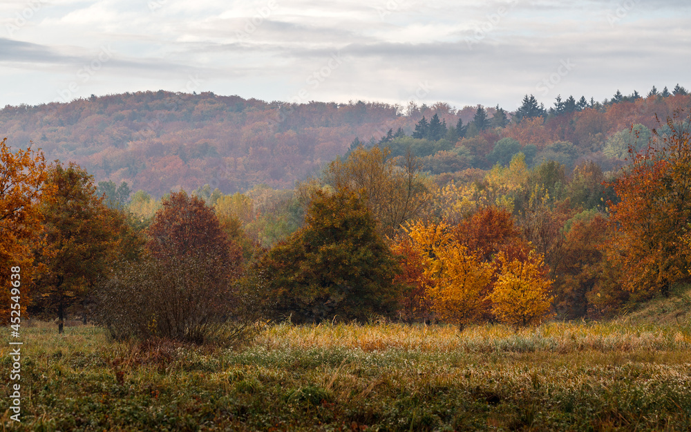 Autumn woodland. Nature in fall season. Colorful forest landscape