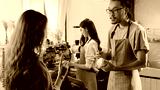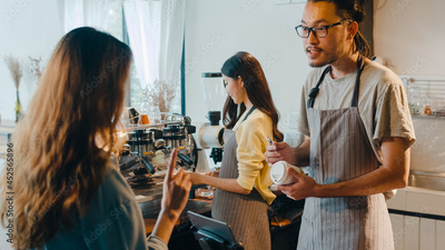 Young Asia male barista waiter taking order from customer standing behind bar counter while talking with customer making note on takeaway coffee cup at cafe restaurant. Owner small business concept.
