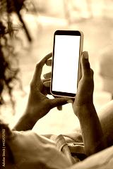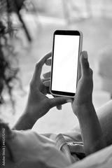 Young African American woman hands holding cell phone with mockup white blank display, empty screen for app ads at home. Mobile applications technology concept, over shoulder close up view.