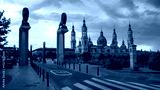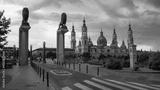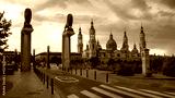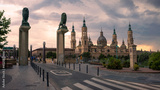 Bronze lions sculpture with the roofs and spires of Zaragoza Cathedral Basilica