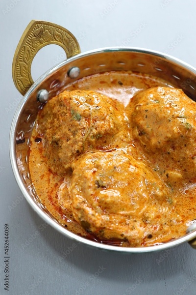 Indian cuisine- Paneer Stuffed dum aloo. Kashmiri Dum Aloo or Potatoes in red gravy over white background. Paneer Bharwa alu. Garnished with coriander. Copy space. Panjabi Dam alu curry.