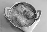 Indian cuisine- Paneer Stuffed dum aloo. Kashmiri Dum Aloo or Potatoes in red gravy over white background. Paneer Bharwa alu. Garnished with coriander. Copy space. Panjabi Dam alu curry.