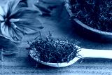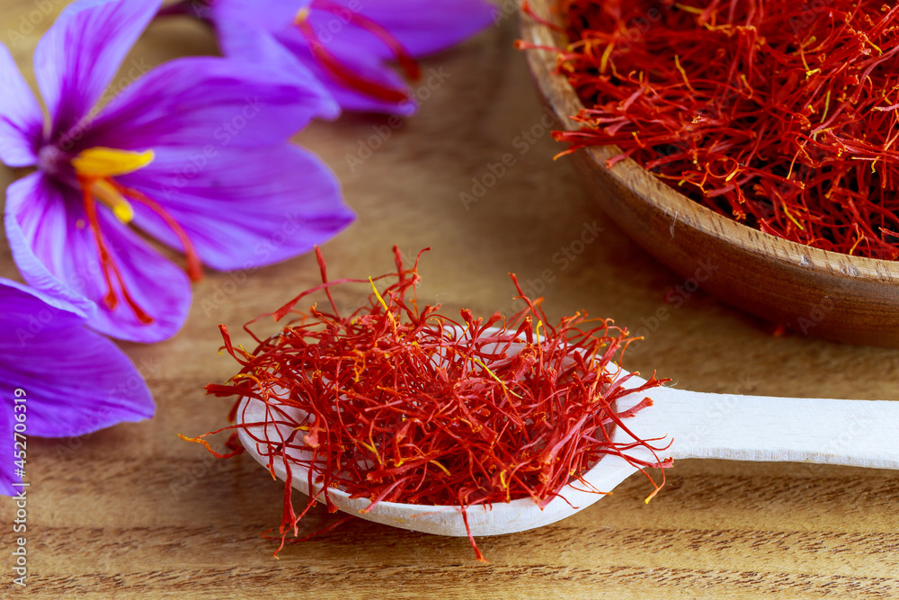 Saffron stamens in a wooden spoon. On the blossomed flower three red stamens which tear off and dry are visible.