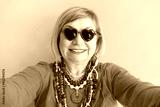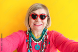 Happy Senior woman pension in stylish clothes. Happy grandmother taking selfie on colored background.