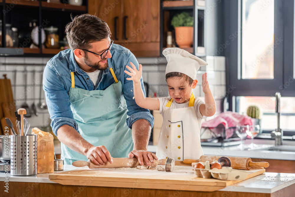 Family together in the kitchen. Father making cake with his toddler son.