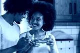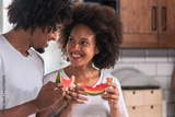 Young African-American couple eating a watermelon in the kitchen