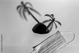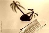 palm tree figurine and medical protective mask on a pink and turquoise background, minimalism, vacation