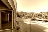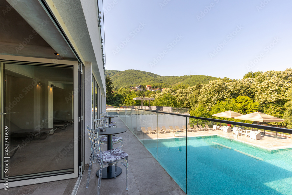 View to a outdoor swimming pool in a modern hotel