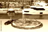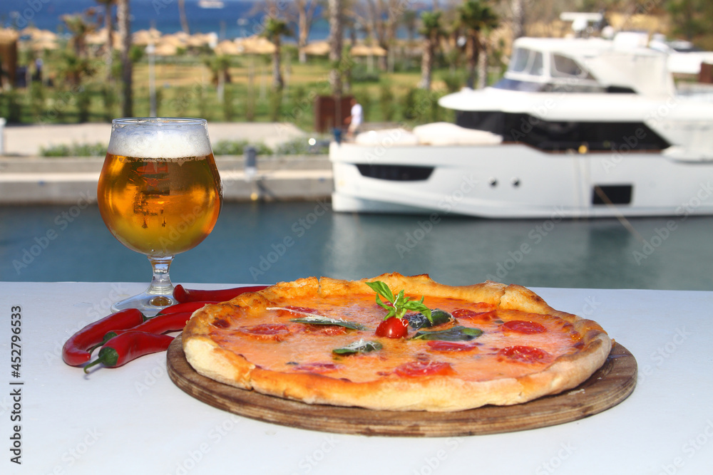 assorted pizza with different fillings: salami, tomatoes, mushrooms, bacon, sun-dried tomatoes. Horizontal frame. With Cold Beer and seascape.