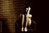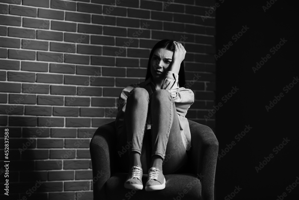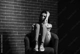 Black and white portrait of depressed young woman sitting near brick wall