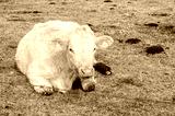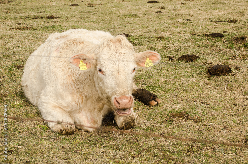 A white cow sleeps and watches on a spring day.