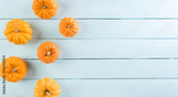Top view of orange pumpkin on pastel wooden background with copy space for text. Halloween, autumn decoration concept.