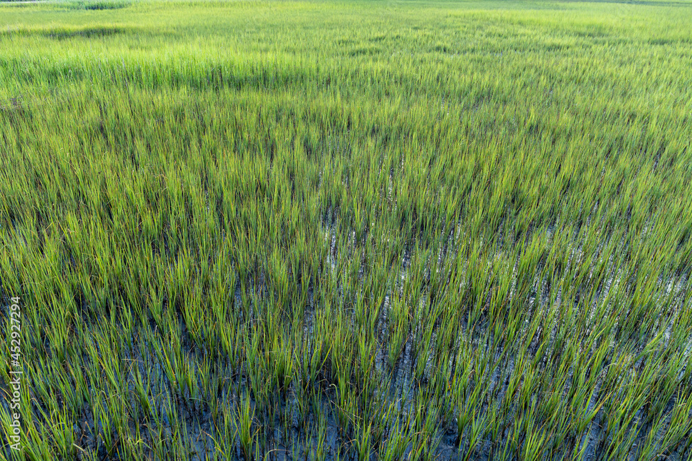 Background of green salt marsh grasses viewed from above, Mount Pleasant South Carolina, horizontal aspect