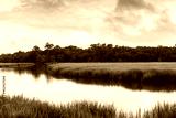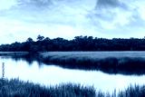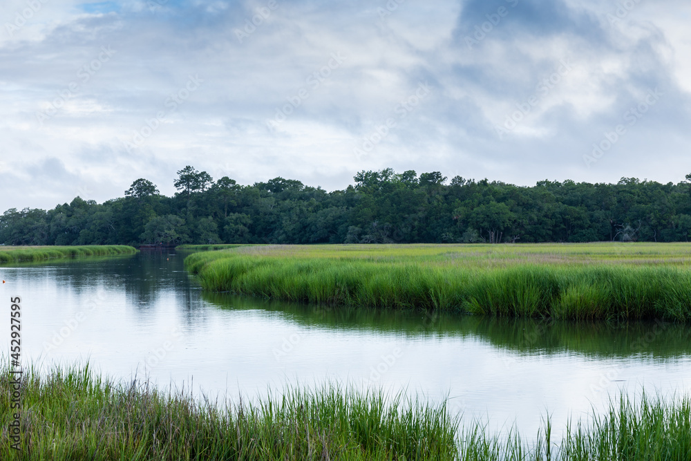 Early morning sunlight reflected in the waterway of a salt marsh, distant treeline and brilliant emerald green grass, horizontal aspect