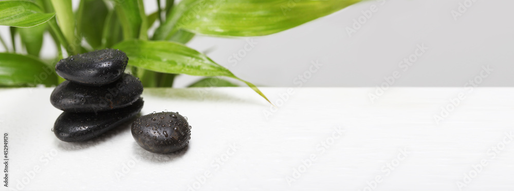 Black stone and Green leaf with waterdrops. Nature horizontal background.