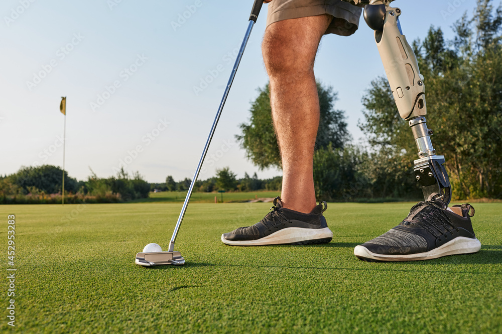 Professional golfer with prosthetic leg hitting with putter on golf ball during golfing. Concept of willpower of people with disabilities in sport