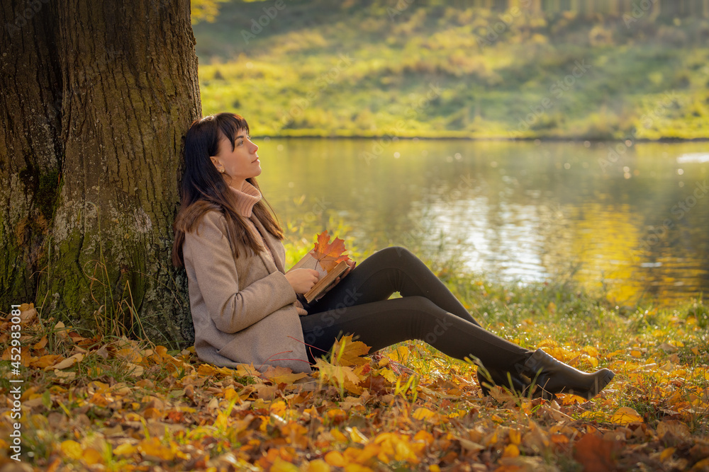portrait of a young woman in an autumn park in the fall season with a book and maple leaves