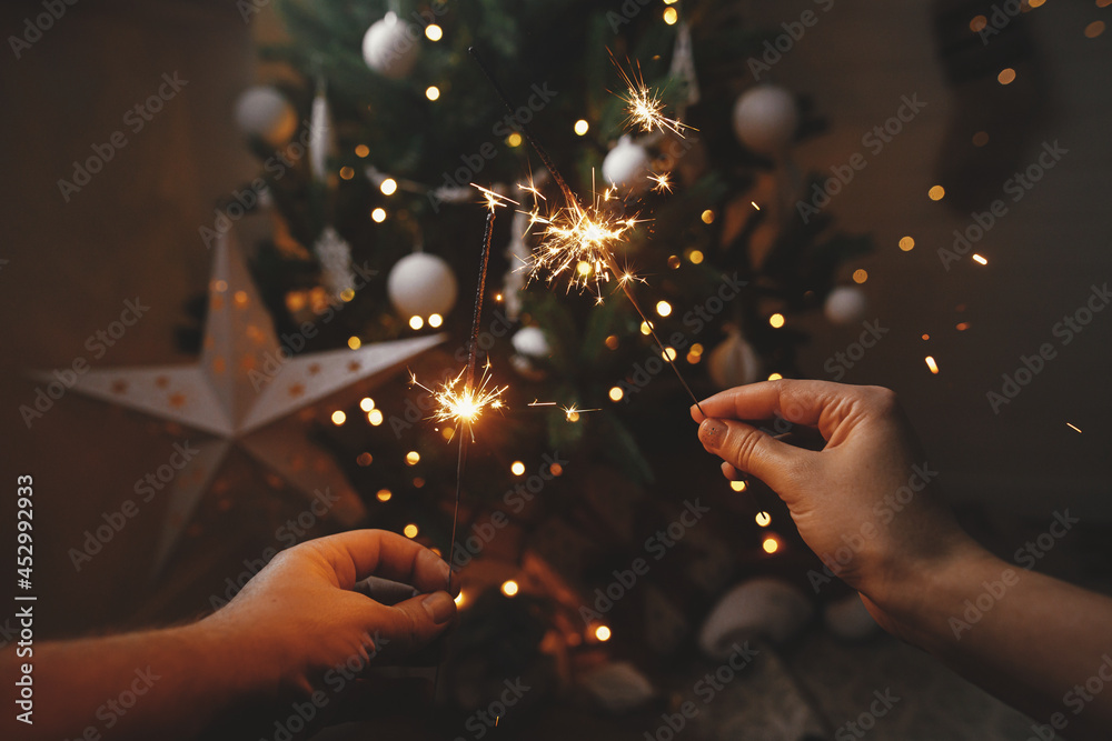 Hands holding burning sparklers on background of christmas tree and glowing star in festive scandinavian room. Happy New Year! Couple celebrating with firework bengal lights. Atmospheric moment