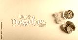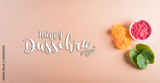 Happy Dussehra. Yellow flowers, green leaf and rice on pastel background. Dussehra Indian Festival concept.