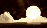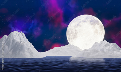 golden yellow full moon starry sky Reflecting the sea with white icebergs. The 15th day of the waxing moon or Mid-Autumn Festival clear sky. 3D rendering.