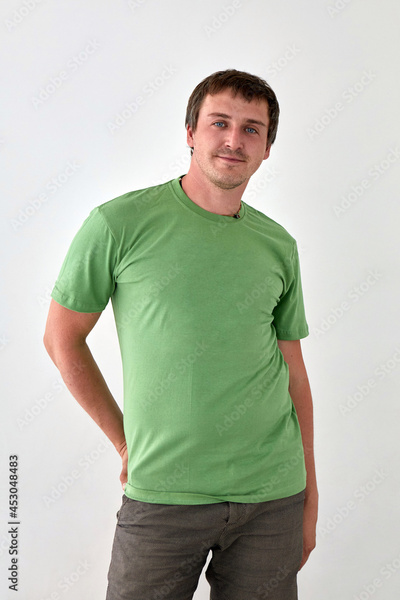 Positive young male in jeans with hand behind and green t shirt standing against white background and looking at camera