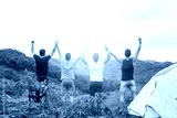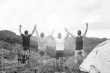 Group of male hiking and camping. Back view of group of young tourists man camping standing raising up his hands on mountain