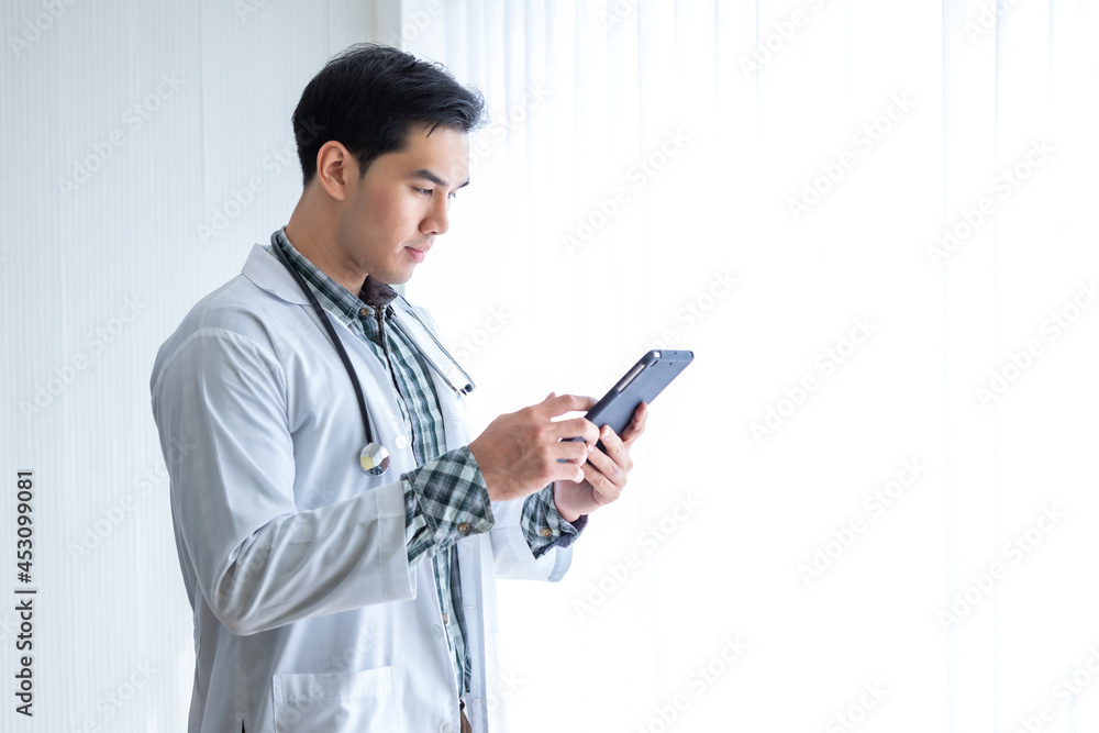 Asian Young man doctor therapeutic advising with positive emotions holding up and showing digital tablet in hospital background,copy space