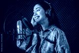 Happy cheerful pretty smiling of portrait of young Asian woman vocalist Wearing Headphones recording a song front of microphone in a professional studio
