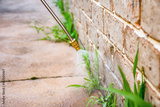 Spraying weed killer herbicide to control unwanted plants and grass on a backyard. Building exterior